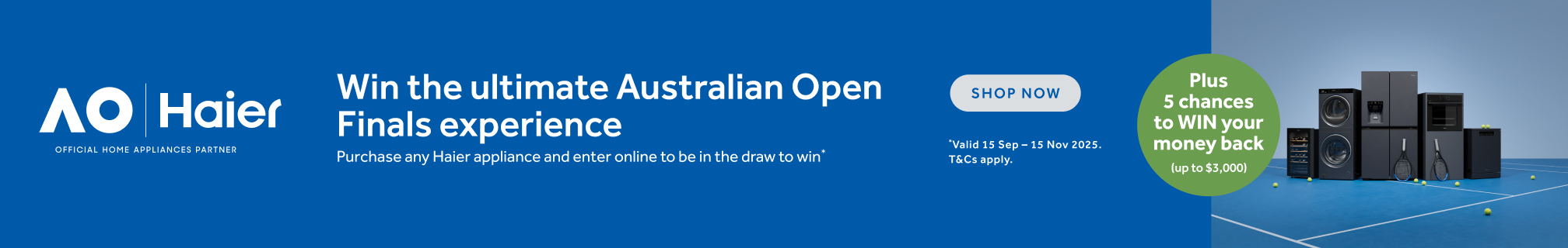 Purchase any Haier appliance from a participating retailer and enter the competition online to win an all-inclusive trip for two to the Australian Open 2026, valued at up to NZD $9,000, or be one of five winners to receive your purchase price back, up to the value of $3,000.