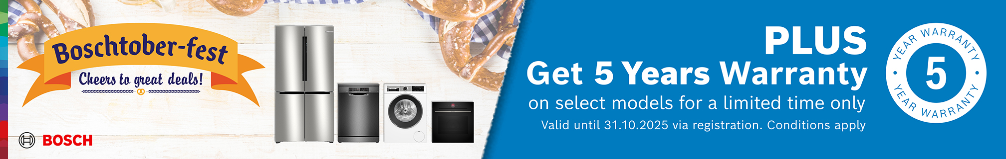 Purchase an Eligible Series 6 or Series 8 Bosch kitchen or laundry appliance between 27 August to 31 October 2025 and get a 5 Year Warranty (via registration only).