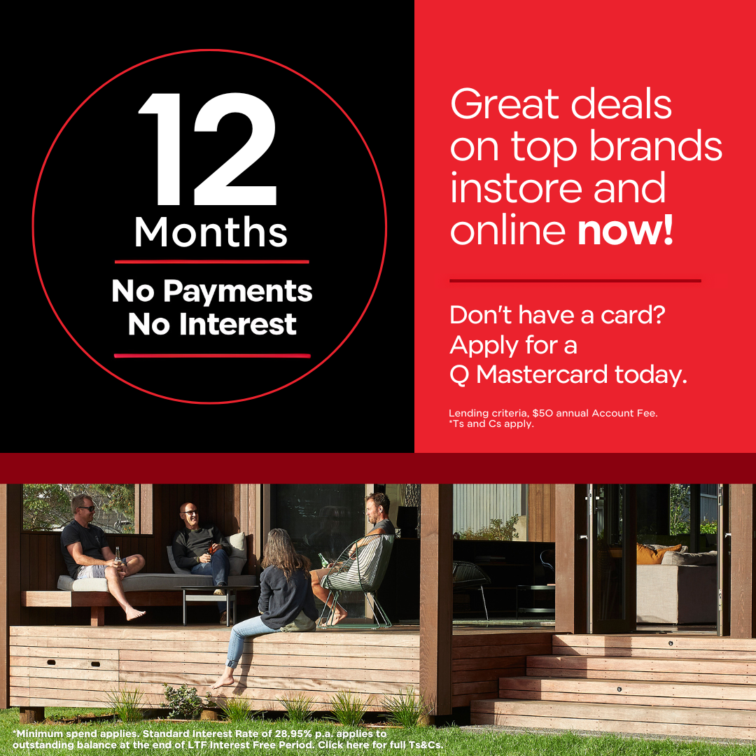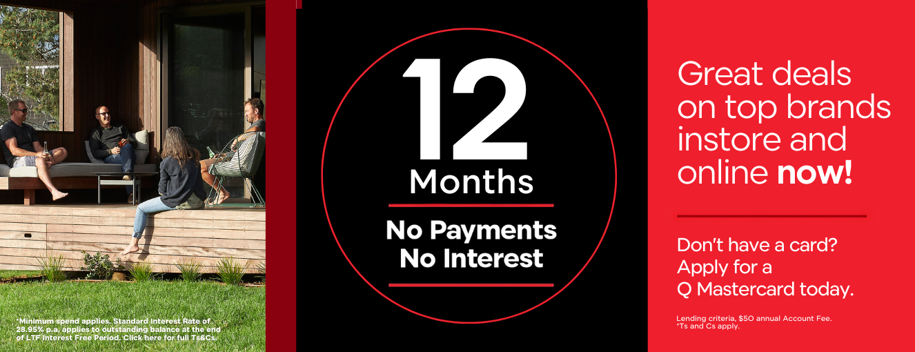 Applies to in-store purchases $499 & over. Lending criteria, $50 Annual Account Fee, fees, T&Cs apply. Standard Interest Rate (currently 28.95%) applies to any outstanding balance at end of interest free period.$55 Establishment Fee or $35 Advance Fee applies to Long Term Finance Purchases.