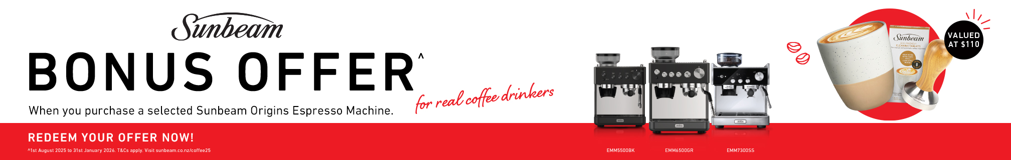 Purchase selected Sunbeam Origins coffee machine from a participating retailer between 1st August and 31st January 2026 and be eligible to claim bonus coffee gift *(via redemption only).